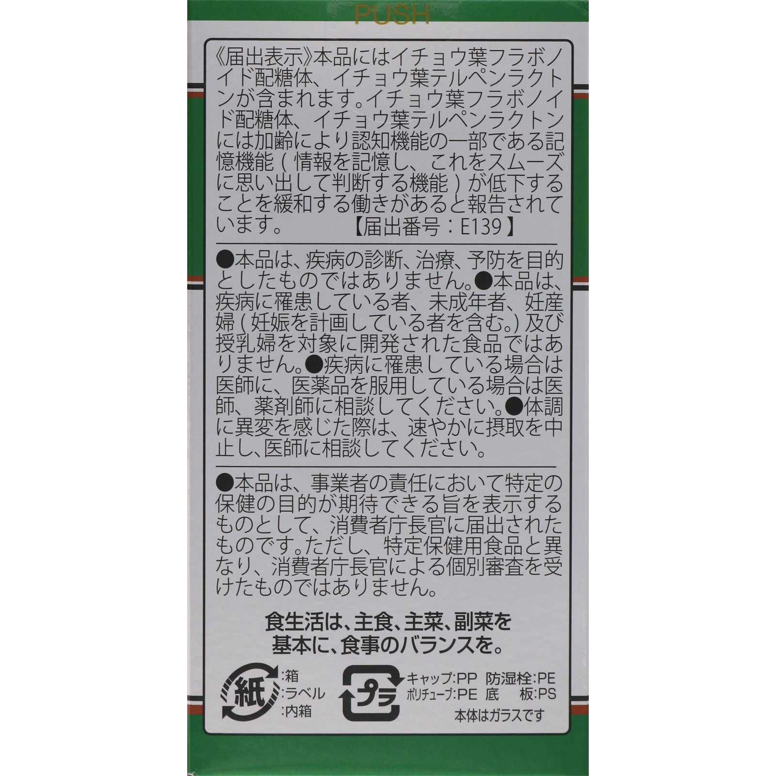 本品にはイチョウ葉フラボノイド配糖体、イチョウ葉テルペンラクトンが含まれます。イチョウ葉フラボノイド配糖体、イチョウ葉テルペンラクトンには加齢により認知機能の一部である記憶機能(情報を記憶し、これをスムーズに思い出して判断する機能)が低下することを緩和する働きがあると報告されています。